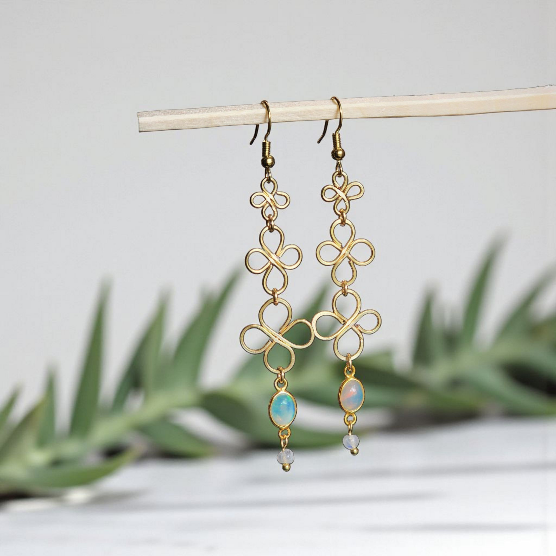 These enchanting earrings are a dance of elegance and mysticism. Crafted with flowing gold-toned loops that form a delicate floral-inspired design, they catch the light with effortless grace. At the base, shimmering oval opals radiate a rainbow of fire, accented by tiny moonstone drops for a touch of ethereal magic.