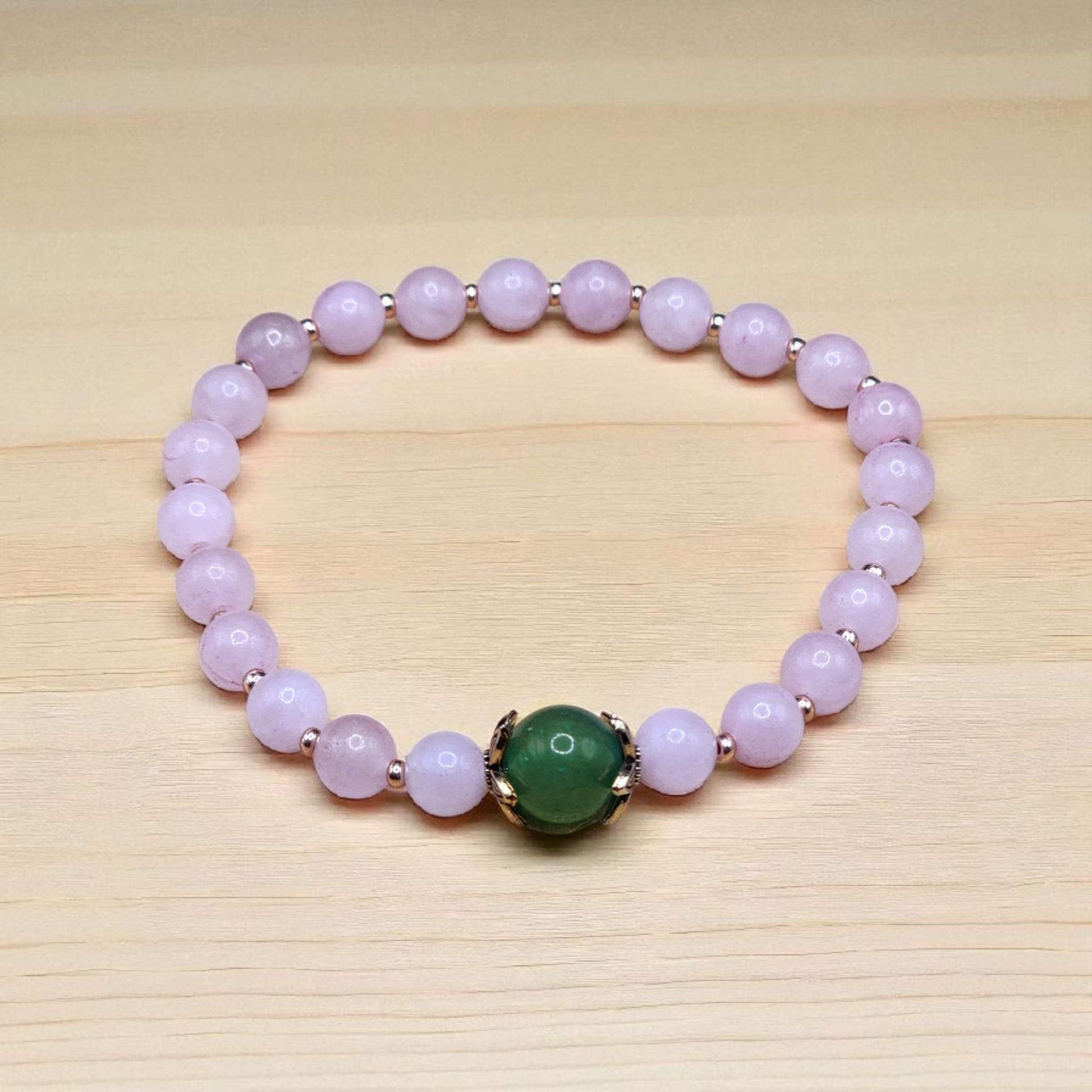 This bracelet blends the soft, nurturing energy of rose quartz with the vibrant, heart-opening power of aventurine. Rose quartz, known as the stone of unconditional love, brings warmth and emotional healing, while aventurine encourages growth, optimism, and abundance. Together, they form a gentle yet empowering pairing that supports both the heart and spirit.