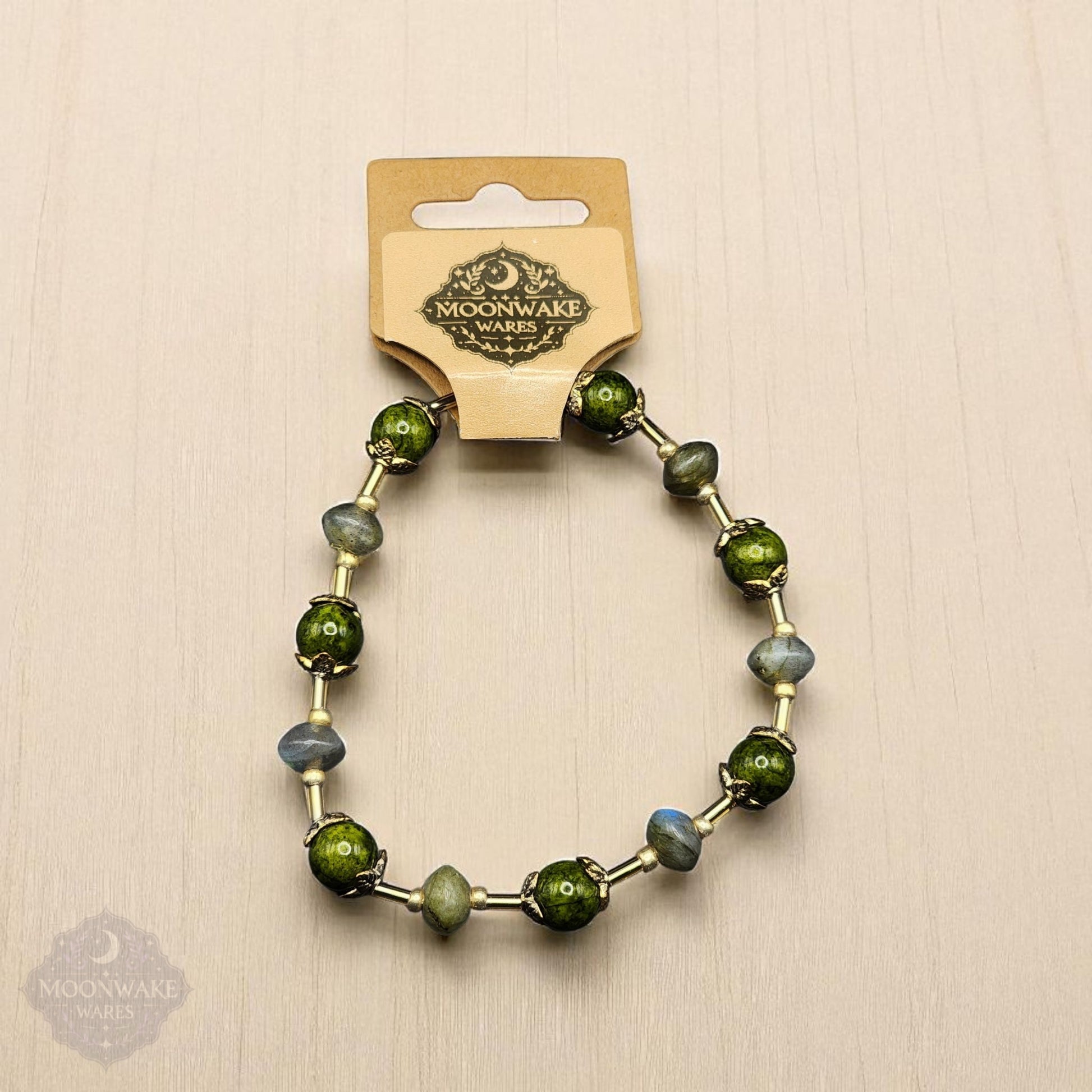 A striking blend of shimmering labradorite and earthy green serpentine, this bracelet is a balance of mystery and grounding energy. Labradorite’s natural flash inspires intuition and transformation, while serpentine promotes calm, renewal, and connection to nature. The warm gold-toned accents add a touch of elegance, making it as perfect for everyday wear as it is for special moments.