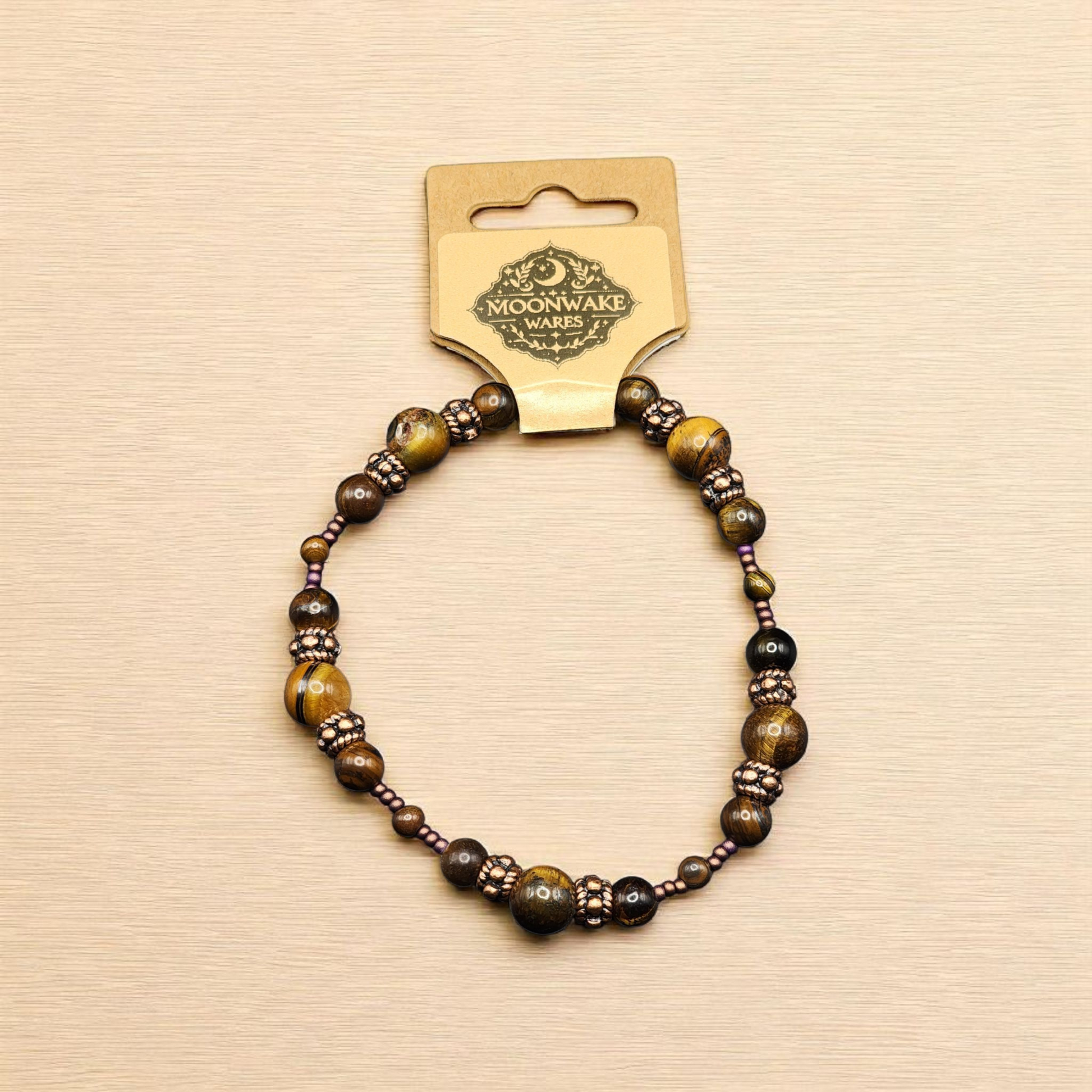 Rich golden-brown Tiger’s Eye beads pair beautifully with warm copper-toned accents in this grounding, earthy bracelet. Tiger’s Eye is known for its protective and empowering energy, making it as meaningful as it is stylish. The mix of textures and tones gives this piece a versatile charm that works for both casual days and dressed-up nights.
