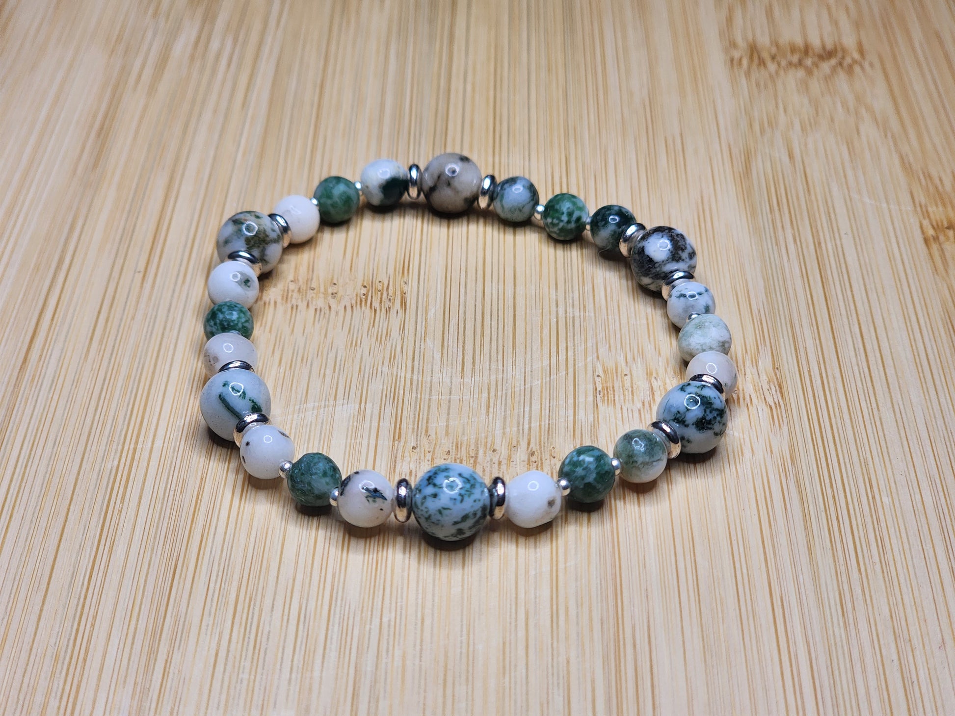 This bracelet features the earthy greens and soft whites of tree agate, accented with silver-toned spacers. Tree agate is known as a stone of stability and grounding, connecting you to the steady rhythms of nature. It encourages growth, balance, and emotional resilience, making it a perfect companion for those seeking calm in the chaos of everyday life.