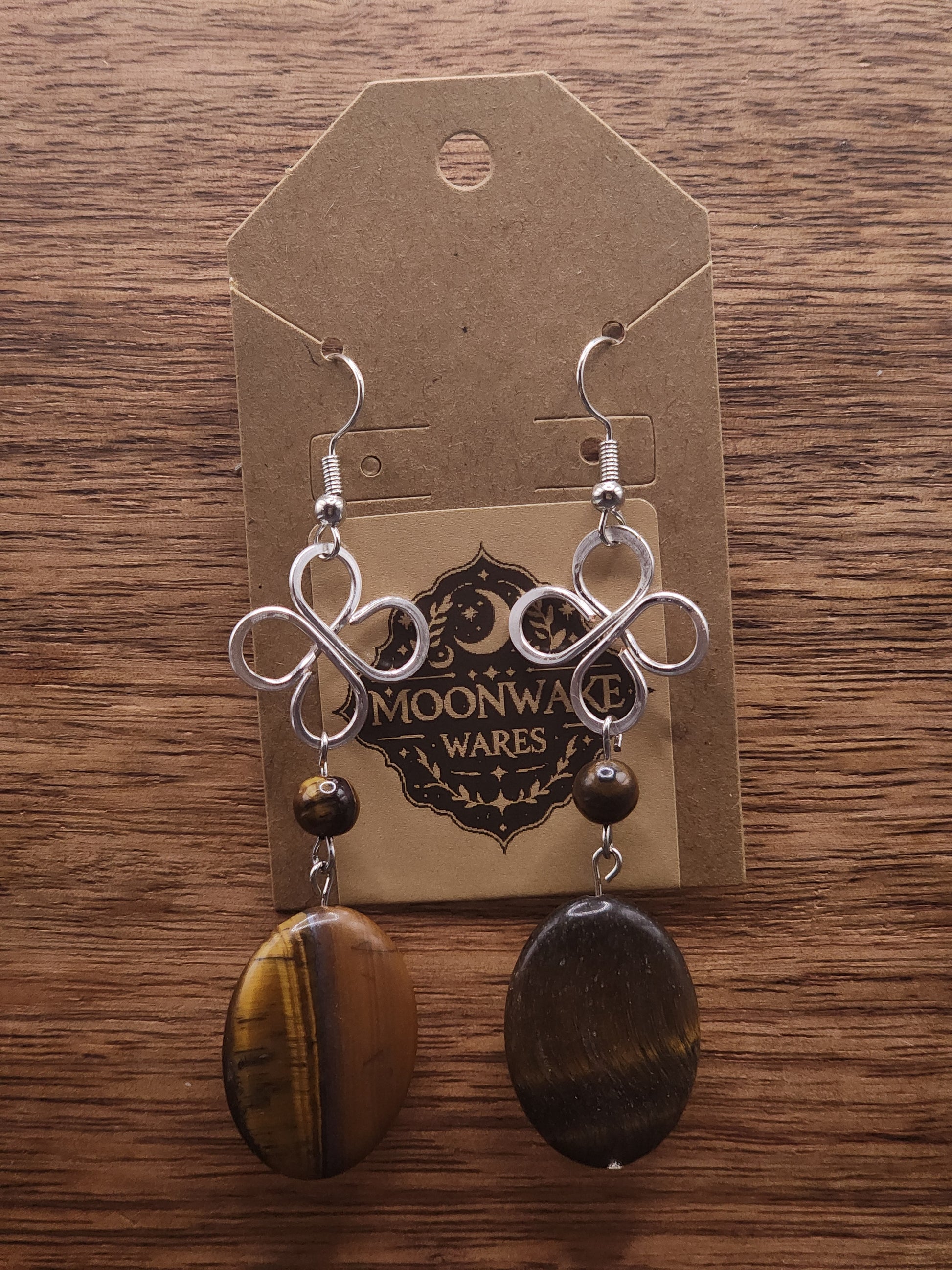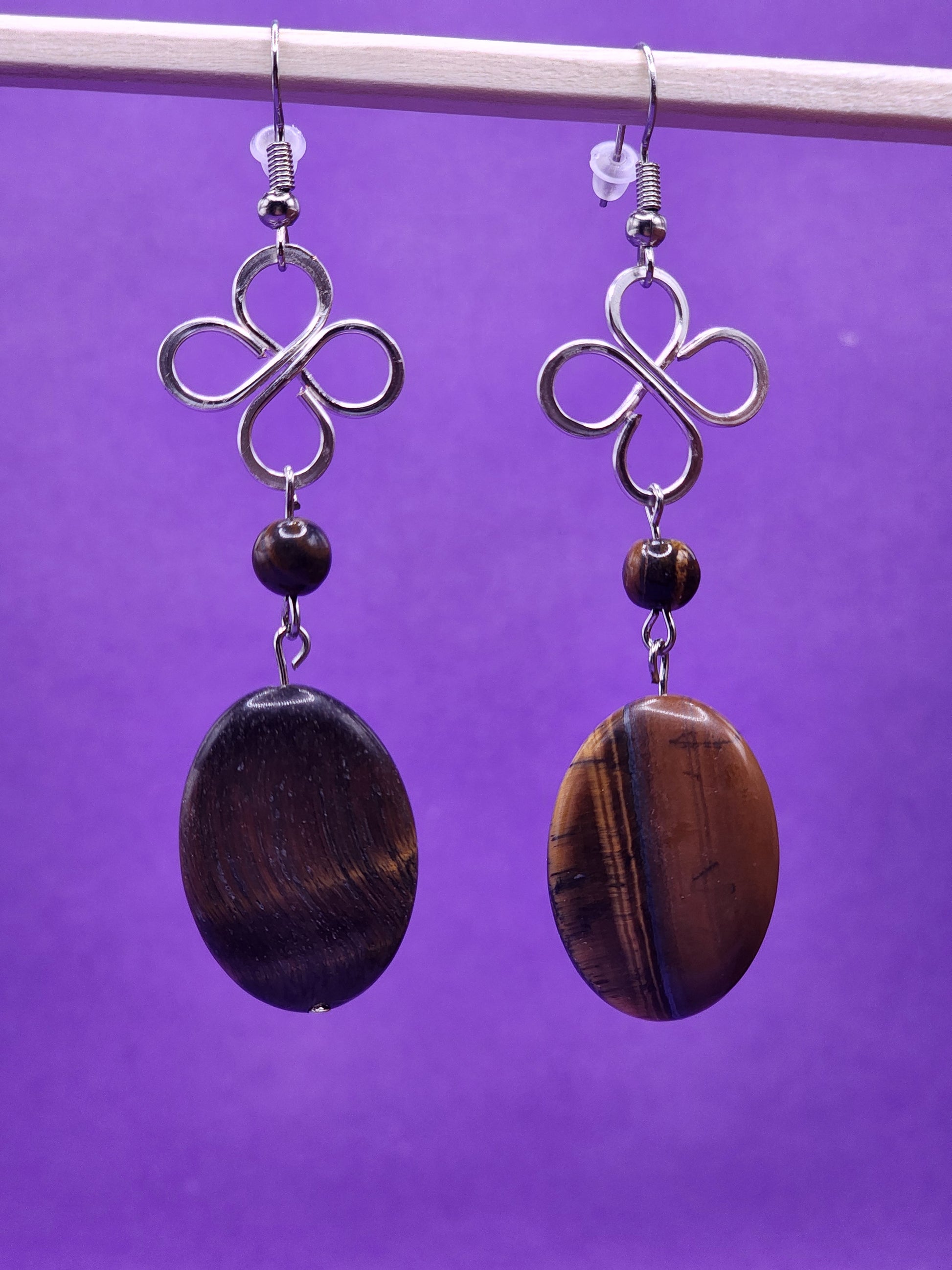 Handmade with silver-finished copper core wire, these earrings feature bold oval tiger’s eye stones paired with a smaller bead accent and a graceful clover-shaped charm. The golden-brown chatoyancy of tiger’s eye catches the light beautifully, giving each pair its own natural shimmer.